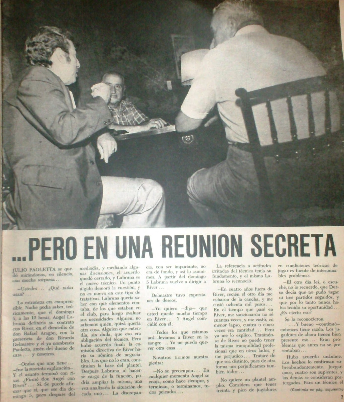 Las charlas se extendieron , los rumores también , nombres como el de Rivelino el crack de Botafogo , Bertoni , Perfumo , Mario Killer , Eduardo Solari ; empezaban a rondar por los pasillos. Lo primero que pidió Labruna , era mantener en el plantel a un jugador discutido aún , que había tenido un año malo , el 10 un tal Norberto Alonso y que el arco sea de un tal Pato Fillol de manera indiscutida y no luchando con Perico Pérez. Luego exigía 5 refuerzos , uno por línea y dos cordobeses de su confianza ; Comelles y el Gringo Ártico. Todo ese run run ponía nerviosos a los hinchas que esperaban el SI de Labruna. El 2 de enero en el club , no hubo acuerdo con tema refuerzos y parecía que todo se caía , Ángel se fue a su casa de Lidoro Quinteros al 1000 , desencantado. Pero la enorme presión de los hinchas , forzó una reunión fuera de programa , para ese fin de semana , de la que solo se enteraron pocos , Buby Neuberger de la Revista River a la cabeza.